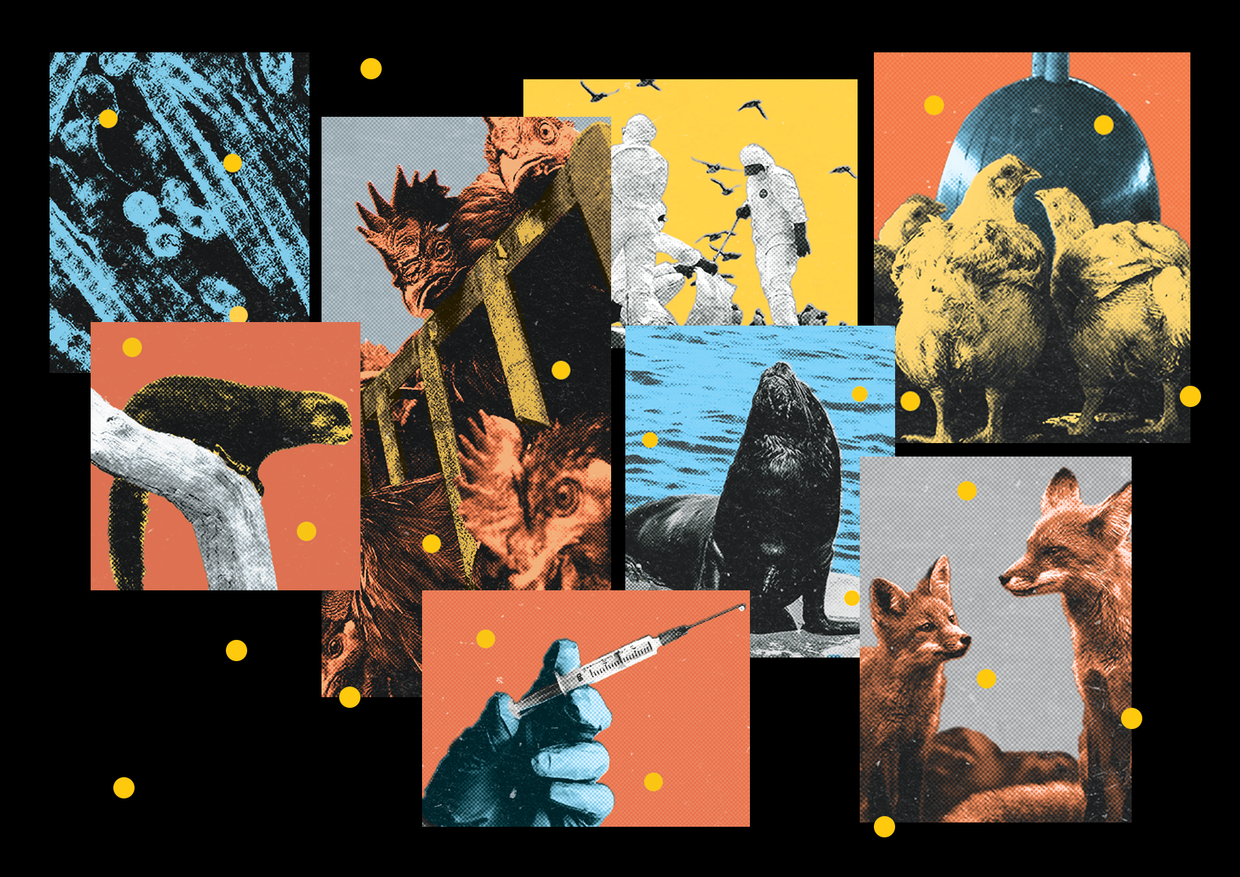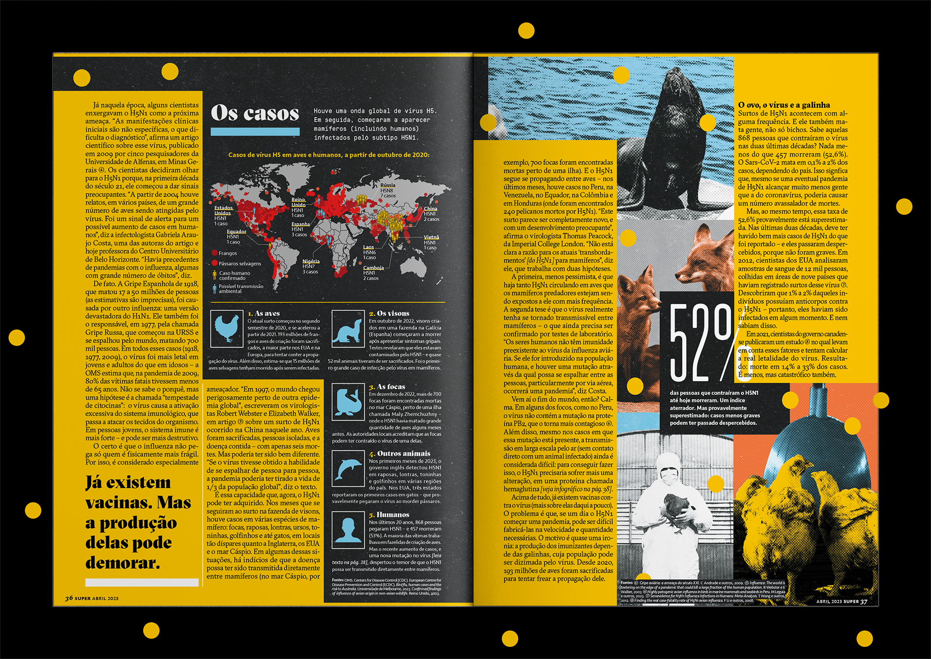 Design, colagens e gráficos para a matéria "A ameaça do H5N1" impressa em 2023 na edição #450 da revista Superinteressante.