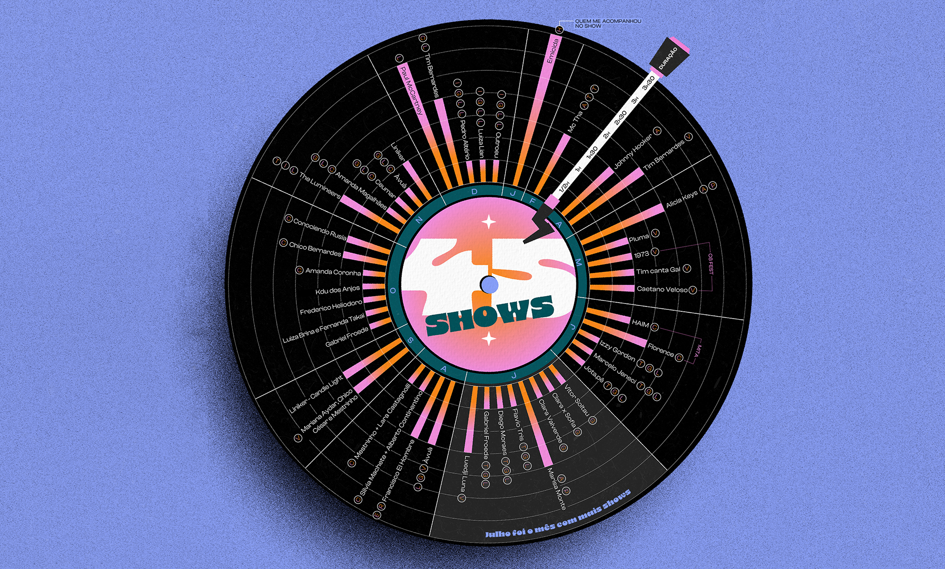O ano de 2023 foi marcado pela grande quantidade de shows que aconteceram no Brasil. Tive a oportunidade de assistir a muitos deles, o que resultou em um projeto de identidade visual e infografia. O projeto captura a essência vibrante e dinâmica dos shows de 2023 e, além de um meio de documentar esses shows, também imortaliza as experiências de forma visualmente impactante.